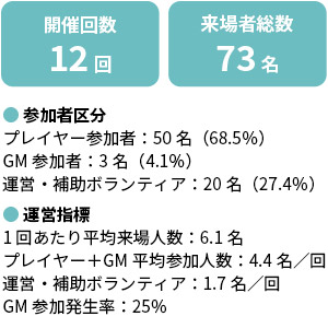 参加者の約50%がマーダーミステリー経験数が5回未満の初心者でした。専門性の高い趣味イベントでありながら経験者に偏らず、新規参加者が継続的に参加できる環境が形成されています。また、のべ73名の来場者のうちリピートにいたらなかった参加者は3名のみであり、極めて高い再参加率となりました。これはイベントの内容だけでなく、心理的安全性が担保されていることを示唆しています。