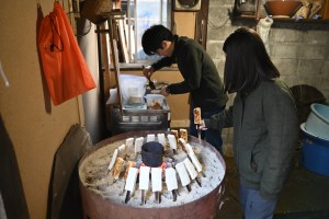 朝早くから薪に火をつけ、豆を挽くところから始めました。初めて豆腐作りを見る方もおり、興味津々のようでした。豆腐をひく(=作るを意味する方言)には何時間もかかるので空いた時間に馬と共に紅葉狩りも行いました。
